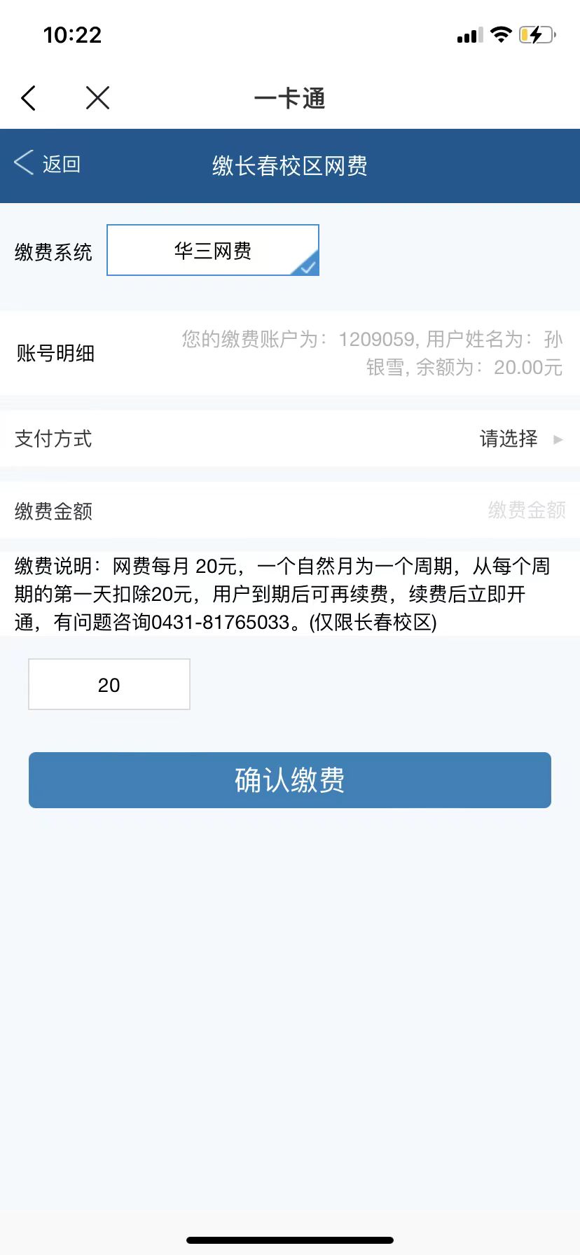 3.由于校园网付费方式是从校园卡账户扣费,因此请提前给校园卡充值足够金额。选择支付方式卡账户,按自然月收费,每月20元,每个自然月第一次使用网络即扣除20元。点击确认缴费。