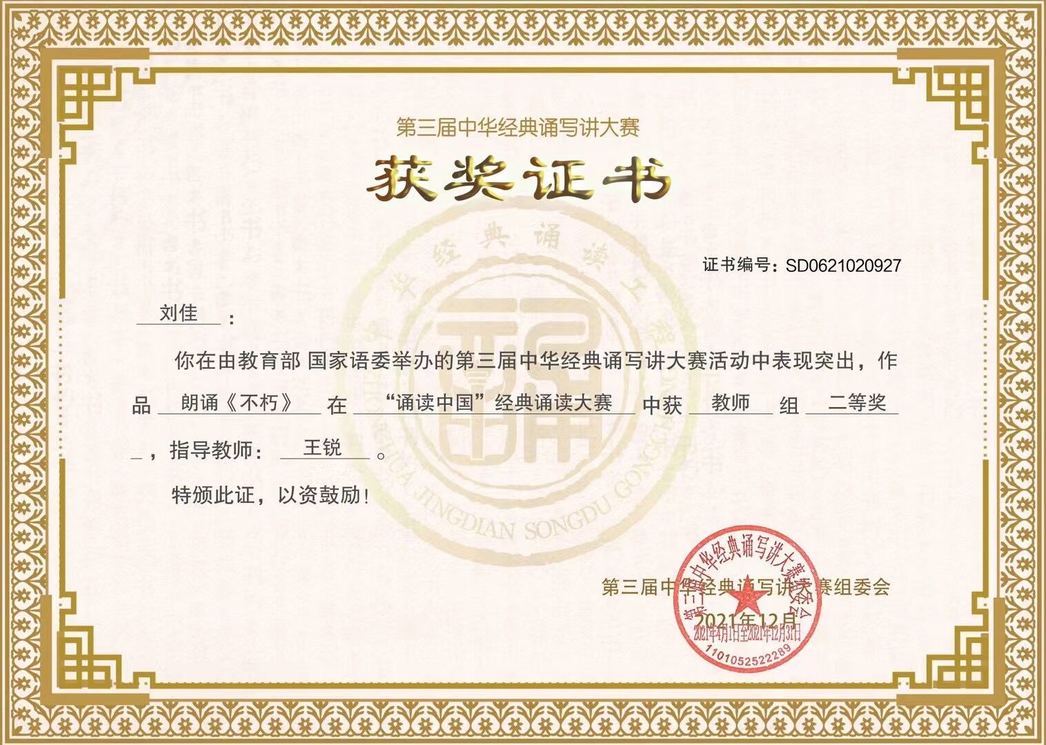 2021年12月,由教育部、国家语委主办的第三届中华经典诵写讲大赛之“诗教中国”“笔墨中国”和“诵读中国”三个赛事落下帷幕。在“诵读中国”经典诵读大赛中,我院刘佳老师的作品《不朽》获得教师组二等奖。