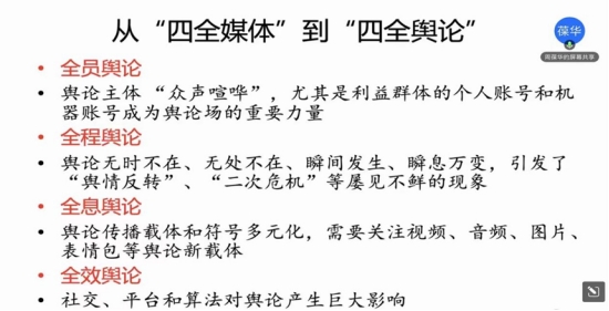 他认为,当前的舆论具体表现出全员、全程、全息与全效的特点,并着重强调了算法推荐系统对舆论的影响,既是时代之必然,同时也要警惕“信息茧房”“回音室”等问题。