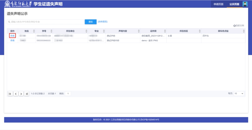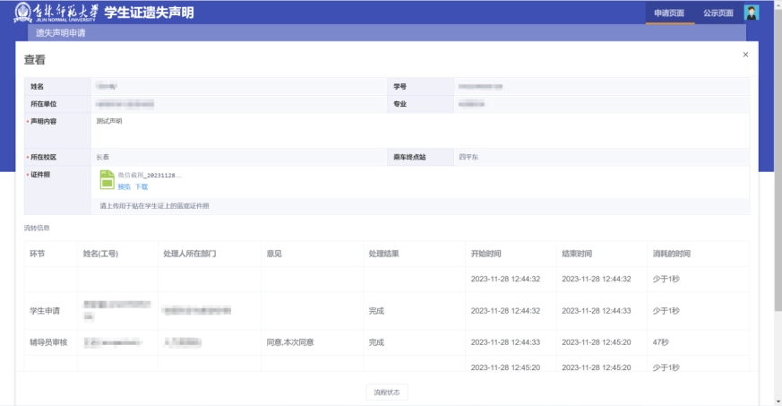 在公示页面中可查看已经被辅导员审核完毕已通过的数据,点击-查看-可查看到内部具体申请信息及审核情况