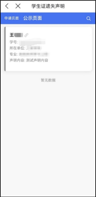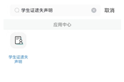 进入“办事大厅”后在上方搜索框处搜索:学生证遗失声明,点击进入“学生证遗失声明”功能。
