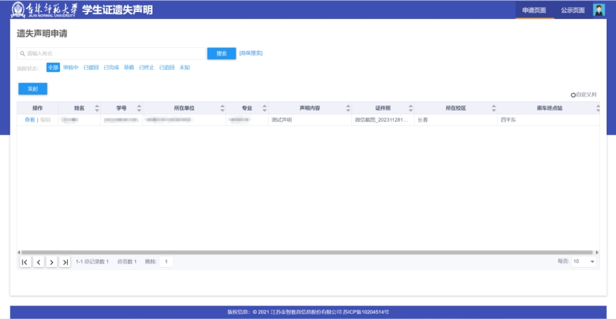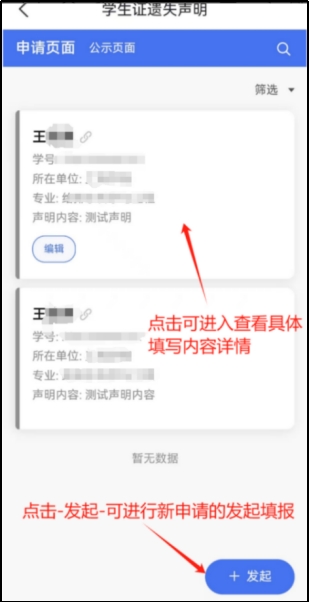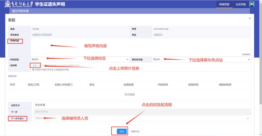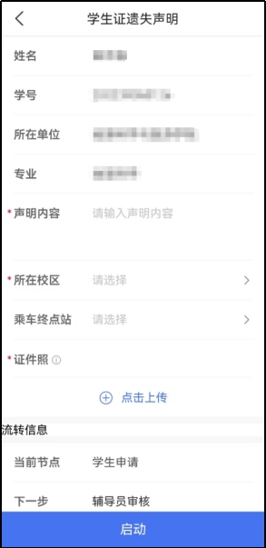 发起:点击-发起-进入学生证遗失声明编写并启动的界面
