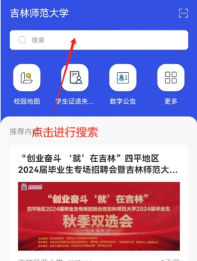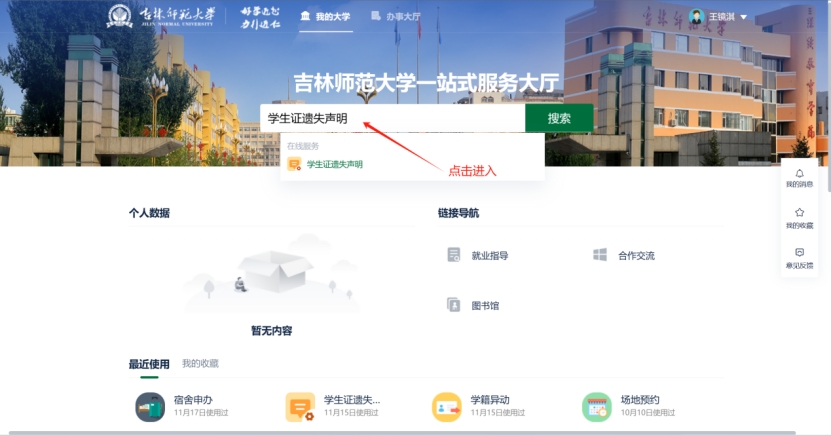 点击页面上方搜索栏,输入“学生证遗失声明”搜索后点击进入