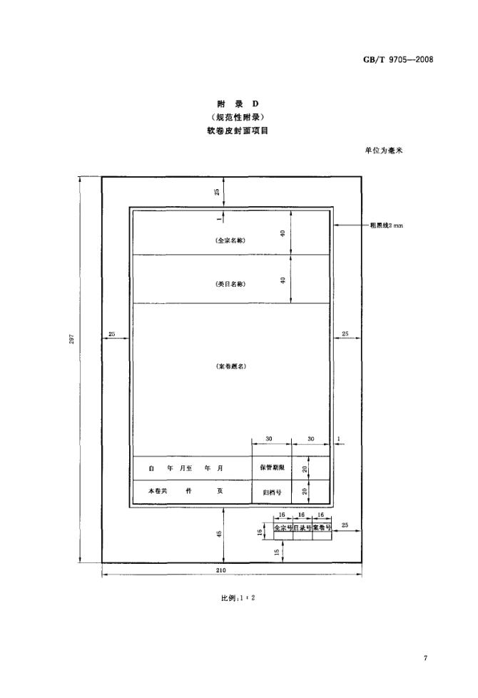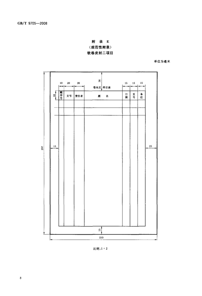 软卷皮封二项目包括:顺序号、文号、责任者、题名、日期、页号、备注。各项目具体位置、尺寸见附录E。