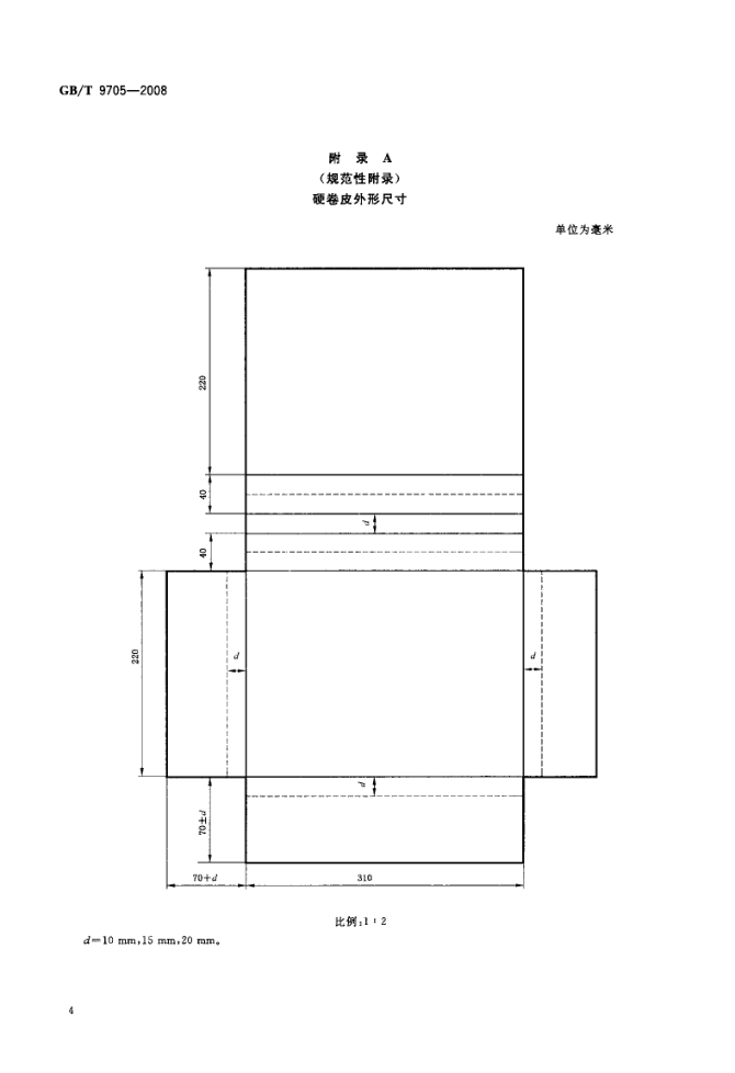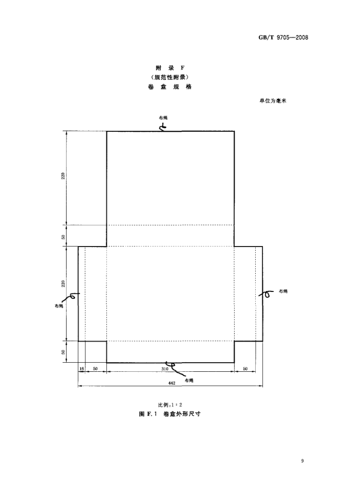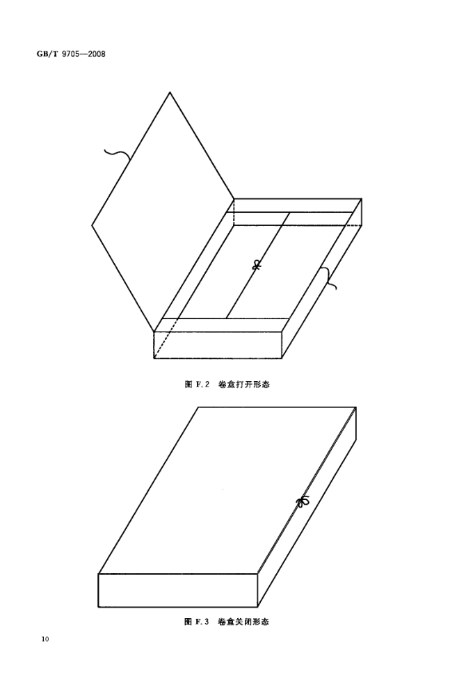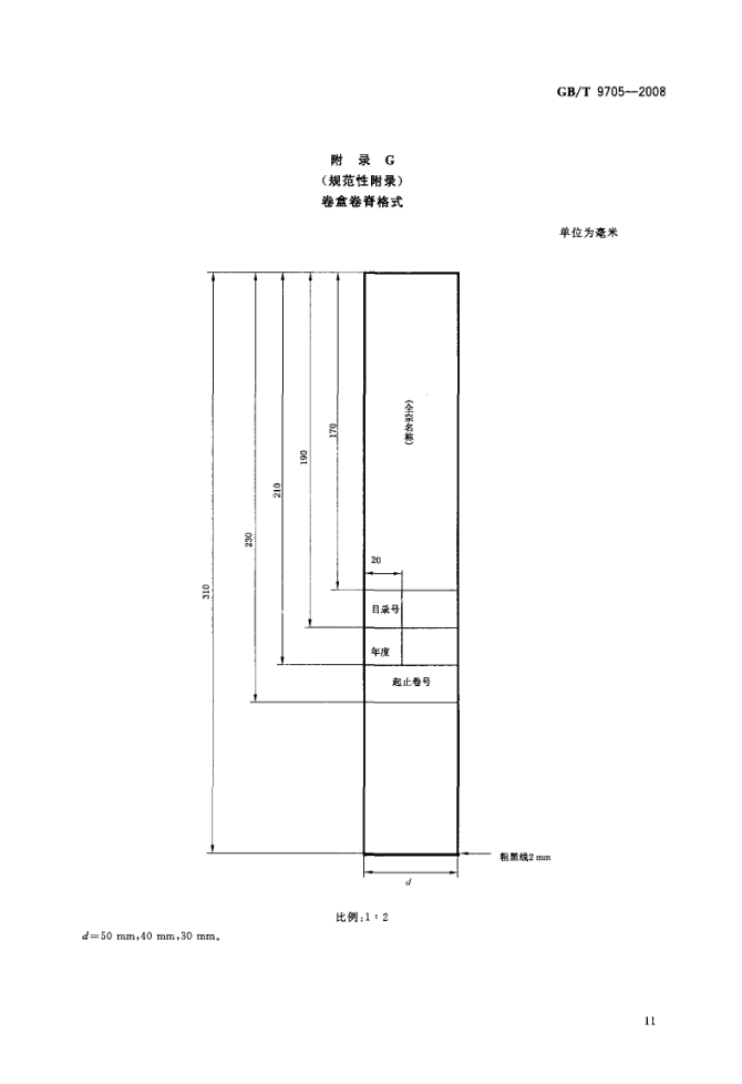 采用310mm×220mm(长×宽),其厚度可根据需要分别设置30mm、40mm或50mm的规格。在盒盖翻口处中部要设置绳带,使盒盖能紧扣住卷盒(见附录F 图F.1、图F.2、图F.3)。