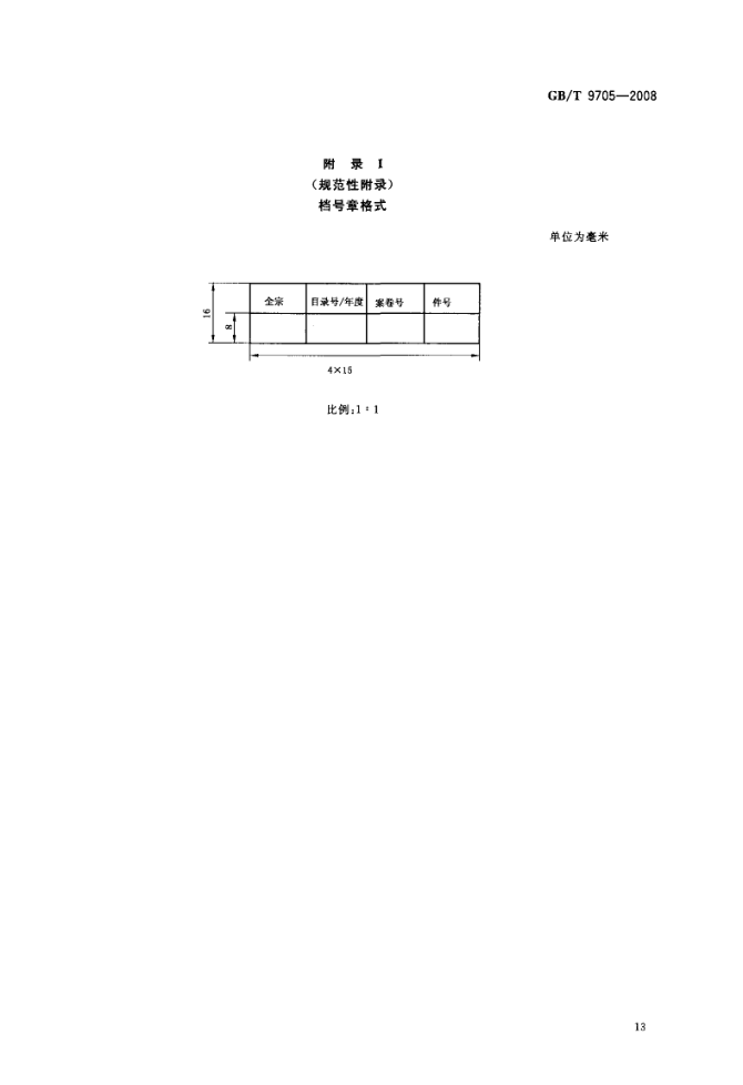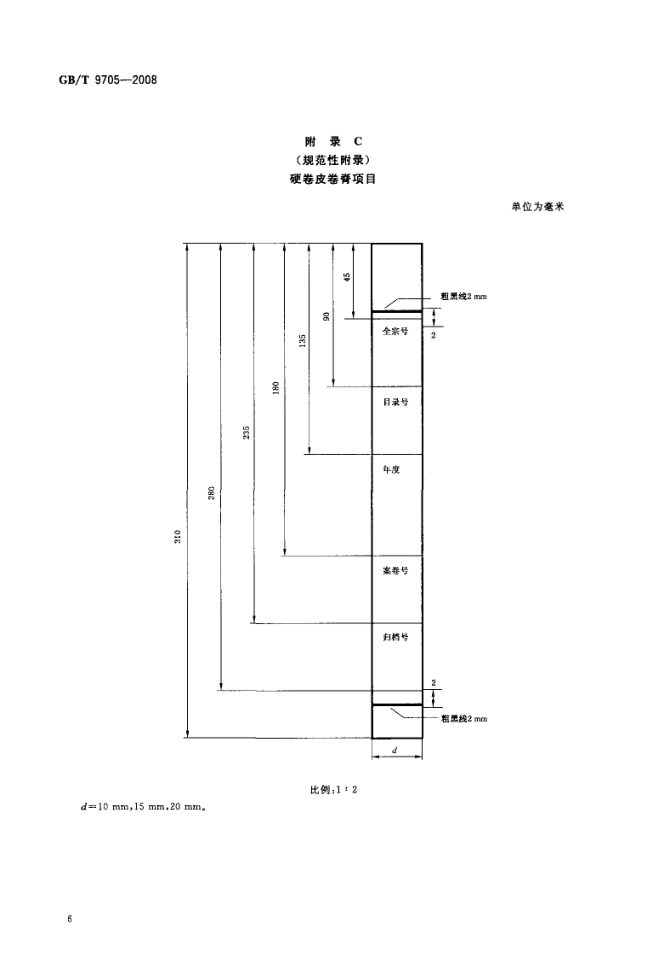 卷脊项目包括:全宗号、目录号、年度、案卷号、归档号,其排列格式尺寸见附录C。