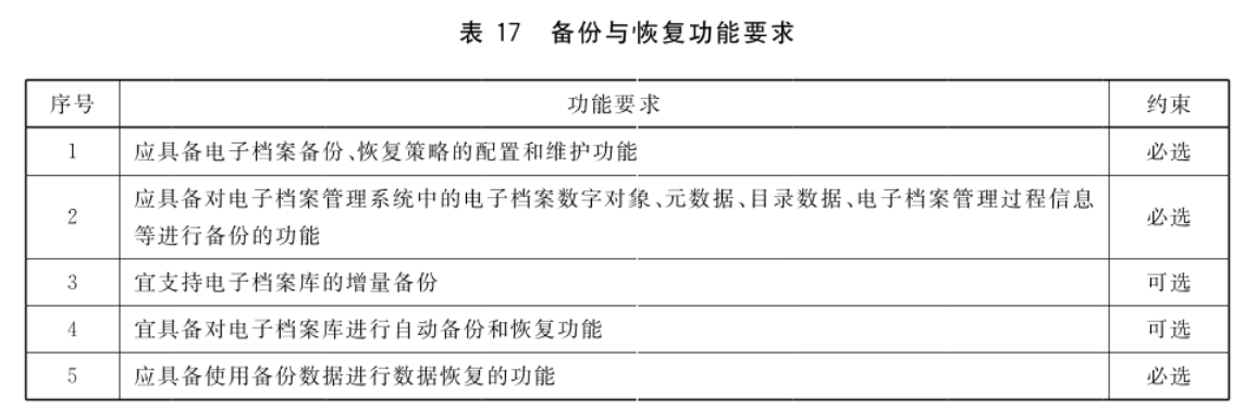 系统应具备对电子档案及其目录数据进行备份与恢复功能,设置备份与恢复策略,制作备份数据,对备份数据和介质进行登记、检测与管理,使用备份数据进行恢复处理,记录备份恢复过程信息。表 17 给出具体要求。