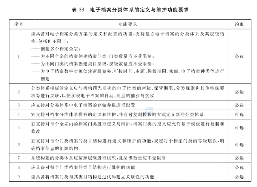 系统应具备电子档案分类方案的定义与维护功能,支持电子档案类目结构的建立与修改、锁定与解锁、导入与导出等处理;系统应内置常用的文书、科技、声像等档案门类的分类方案;系统应支持对会计、业务类等专门档案分类体系的设置。表 33 给出具体要求。