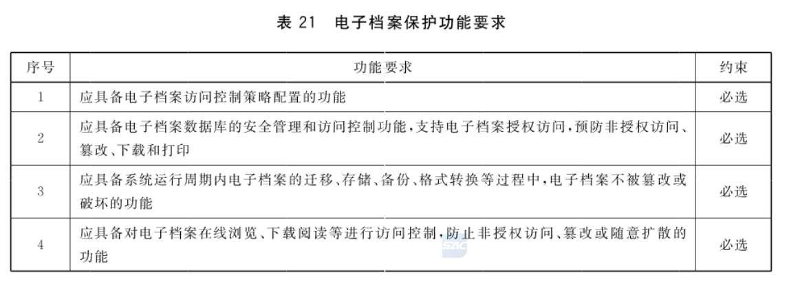 系统应具备电子档案保护功能,保障电子档案不被非授权访问、修改或删除,完整准确记录长期保存过程中相关变动信息。表 21 给出具体要求。
