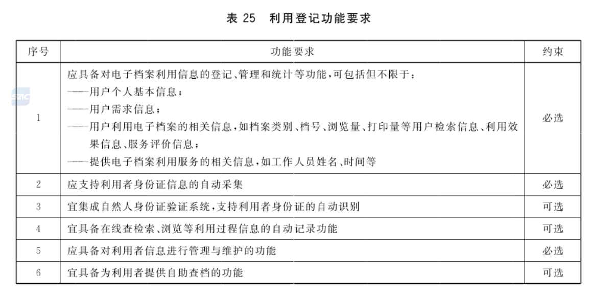 系统应具备电子档案利用登记功能,保存利用者信息,并采取技术手段确保利用过程中电子档案不被非法篡改。表 25 给出具体要求。