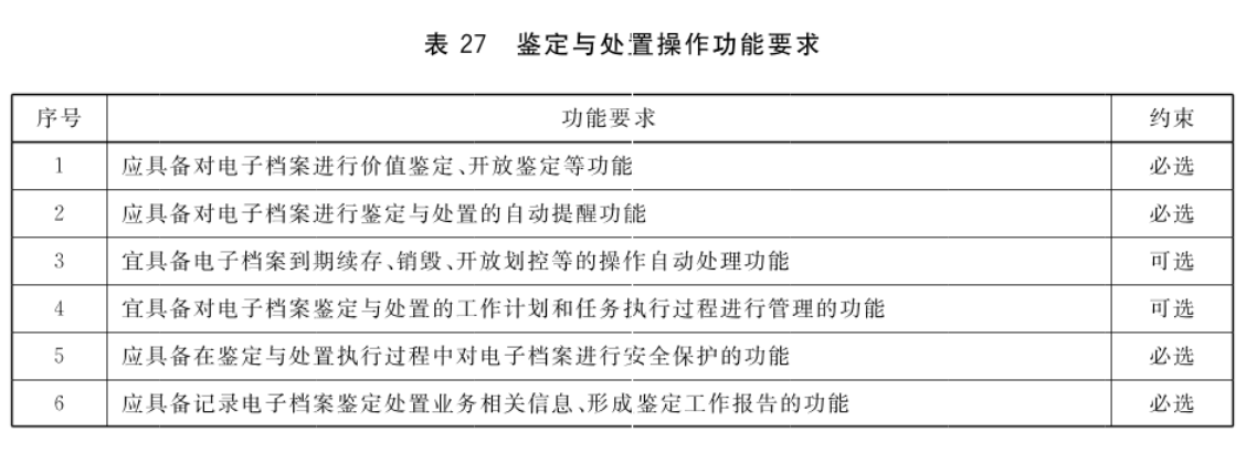 系统应具备电子档案的鉴定与处置操作功能,支持价值鉴定、开放鉴定业务的操作。表 27 给出具体要求。
