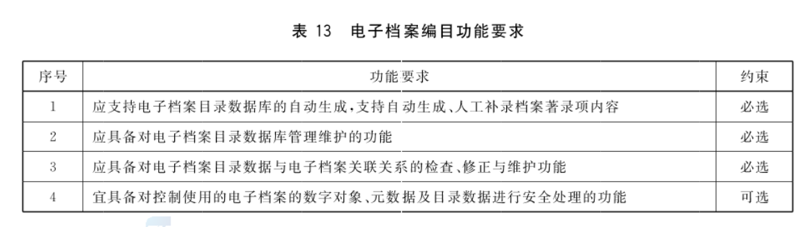 系统应具备电子档案的著录、标引等功能,形成电子档案目录,并与电子档案相关联。表 13 给出具体要求。