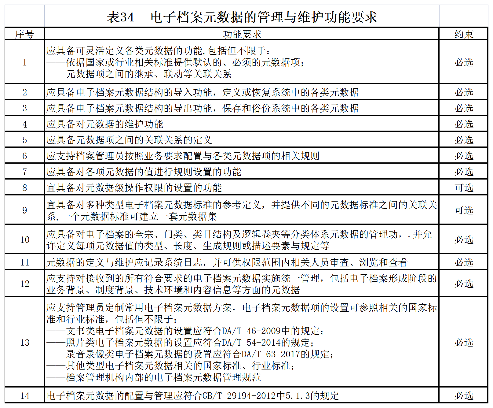 系统应具备电子档案元数据和目录数据的定义与维护功能,内置常见各类电子档案的元数据方案。表 34 给出具体要求。