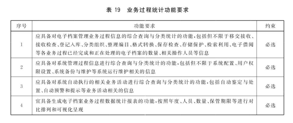 系统应具备对一定时间期限内的电子档案的接收、整理、保存、鉴定、利用等关键业务过程工作情况进行统计的功能。表 19 给出具体要求。