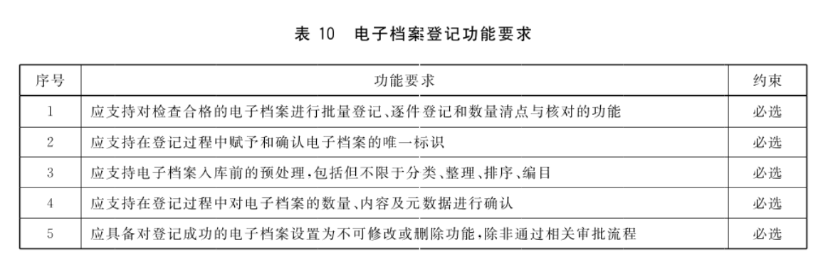 系统运行应具备对检查合格的电子档案进行登记的功能,支持电子档案数量的清点、内容和元数据有效性的验证,赋予电子档案唯一标识。表 10 给出具体要求。
