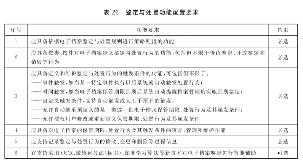 系统应具备按照电子档案的处置规则,建立和配置鉴定与处置条件、策略和流程,支持价值鉴定、开放鉴定等自动提醒功能。表 26 给出具体要求。