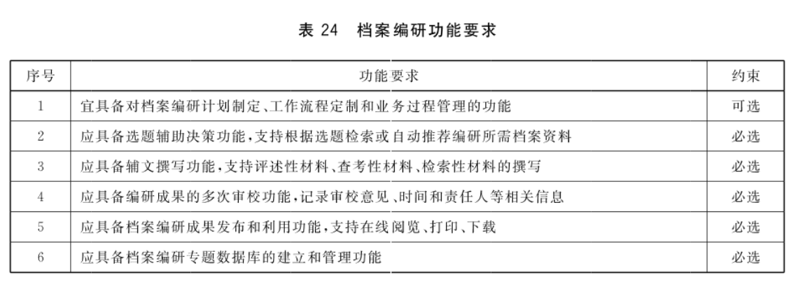 系统应具备辅助档案编研功能,包括但不限于选题、档案查找、档案筛选、文献加工、辅助撰写、审核与校对,以及编研成果发布与管理。表 24 给出具体要求。