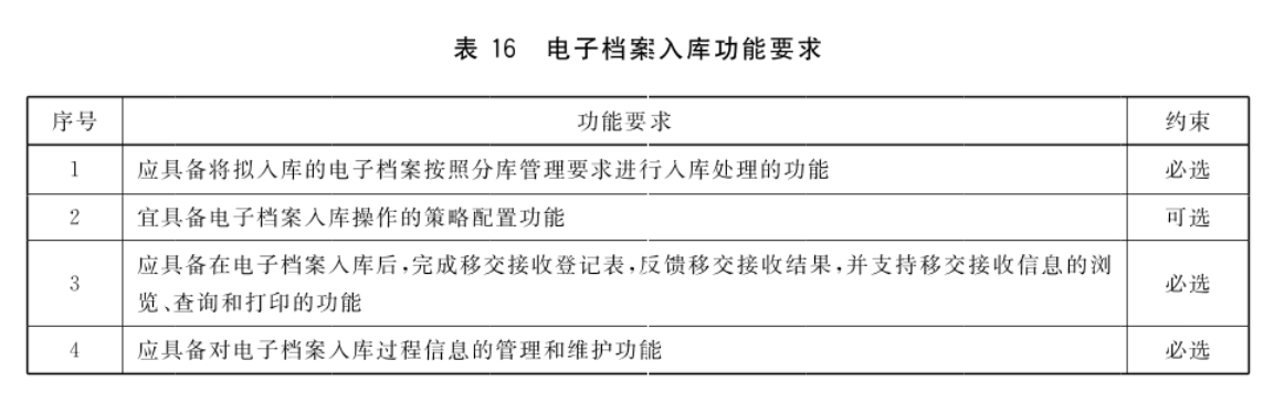系统应具备电子档案入库功能,并保存入库处理过程记录。表 16 给出具体要求。