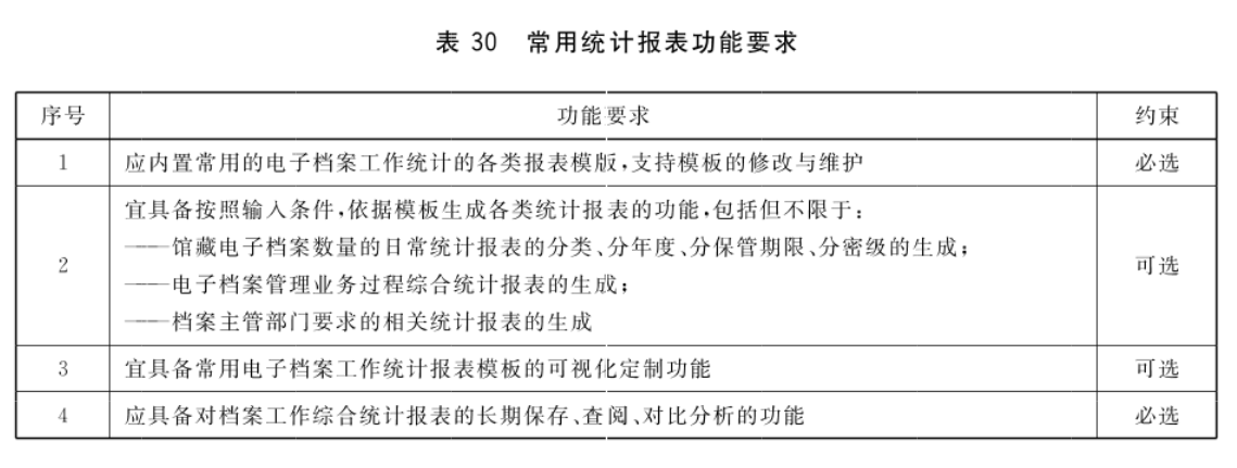 系统应内置常用电子档案工作统计报表模板,并能够按照输入条件生成统计结果。表 30 给出具体要求。