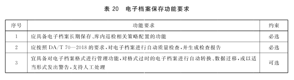 系统应具备在电子档案长期保存过程中对电子档案的真实性、完整性、可用性和安全性等进行库内质量巡检的功能。表 20 给出具体要求。