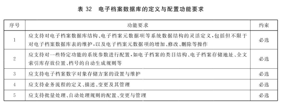 系统应提供电子档案数据库及其存储结构、功能模块、工作流程等的定义与配置功能。表 32 给出具体要求。