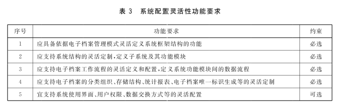 配置应具备灵活性,支持电子档案管理的业务模式、工作流程和数据结构等的灵活定义与部署。表 3 给出具体要求。