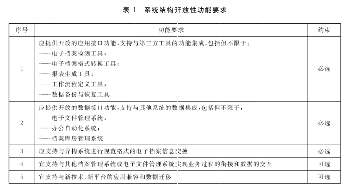 电子档案管理系统的系统结构应具备开放性,可实现与其他系统的功能集成、数据交换与共享,表 1 给出具体要求。