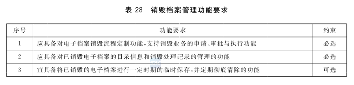 系统应具备对电子档案销毁管理功能,留存已销毁的电子档案的目录信息和销毁处理记录。表 28 给出具体要求。