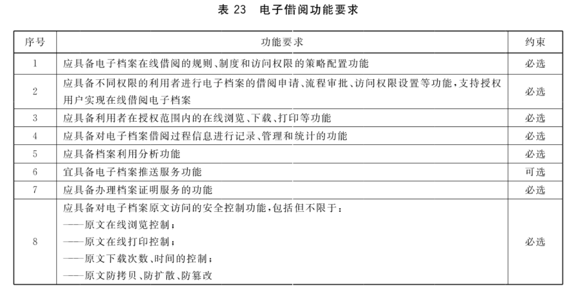 系统应具备电子档案在线借阅服务功能,支持在线申请、在线审批、在线阅览、授权下载与打印等处理,并记录用户使用电子档案的意见和效果等信息。表 23 给出具体要求。