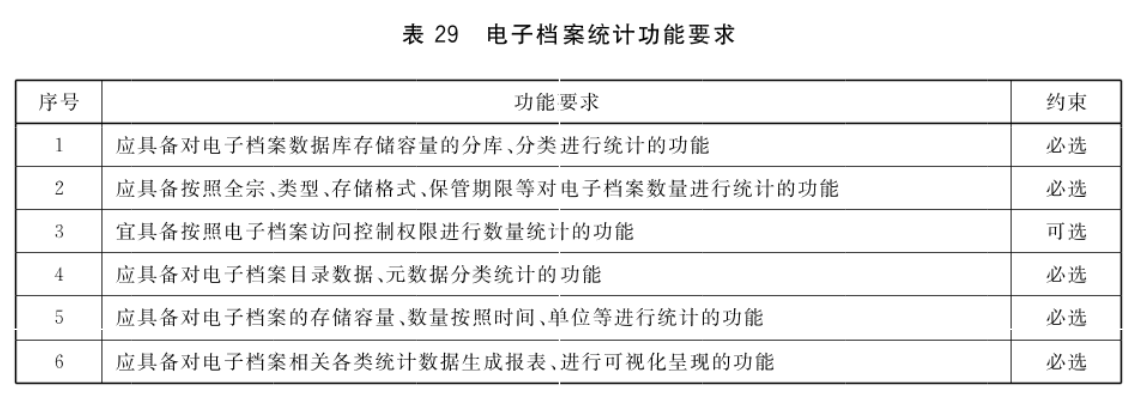 系统应具备对电子档案数量与存储容量的统计功能,可按照档案的全宗、门类、文件格式、开放扣押和年度等进行统计。表 29 给出具体要求。