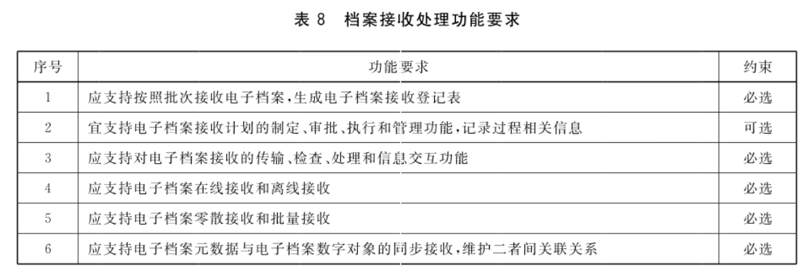 系统应具备电子档案接收功能,支持在线和离线的批量接收与处理,并保存过程信息。表 8 给出具体要求。