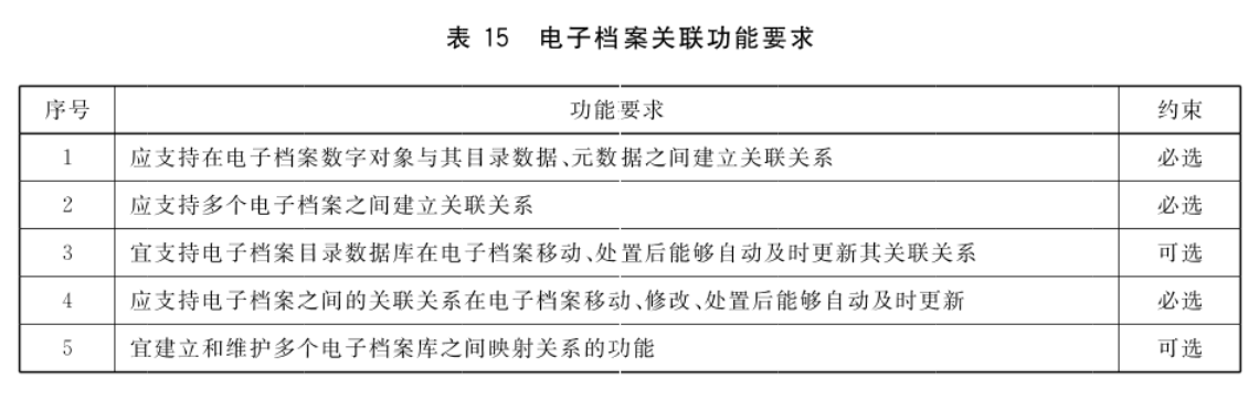 系统应具备维护电子档案各组成部分及相关数据之间、电子档案与电子档案之间的关联功能。表 15 给出具体要求。