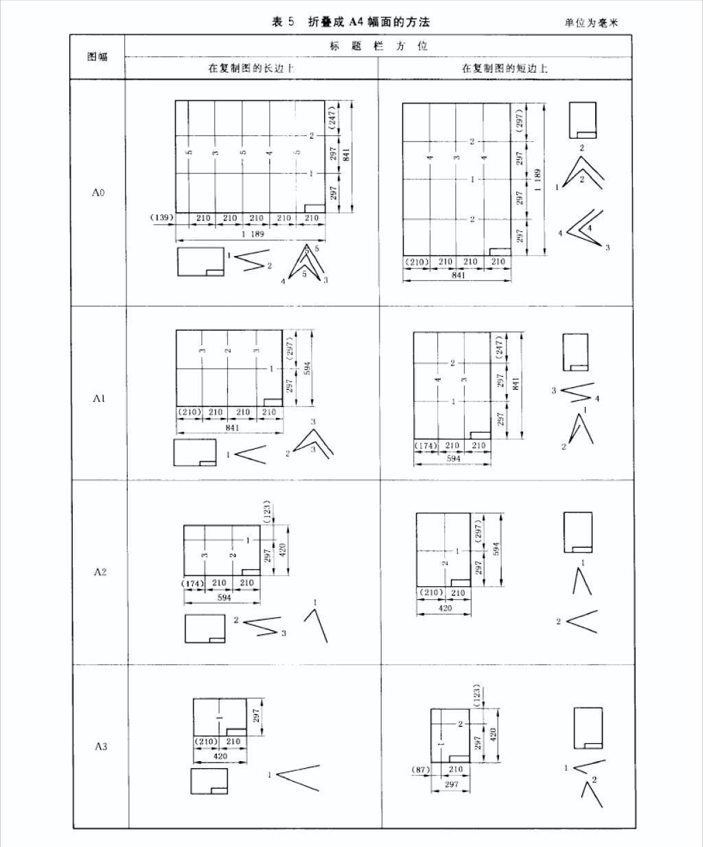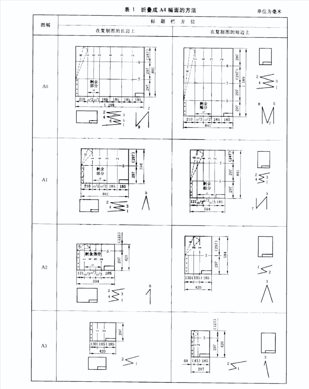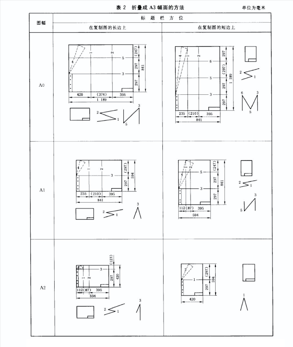 当标题栏位于复制图的短边上时(见表1和表2)。可将加长复制图的长边部分折叠成等于或小于297 mm的尺寸,使标题栏露在外面。