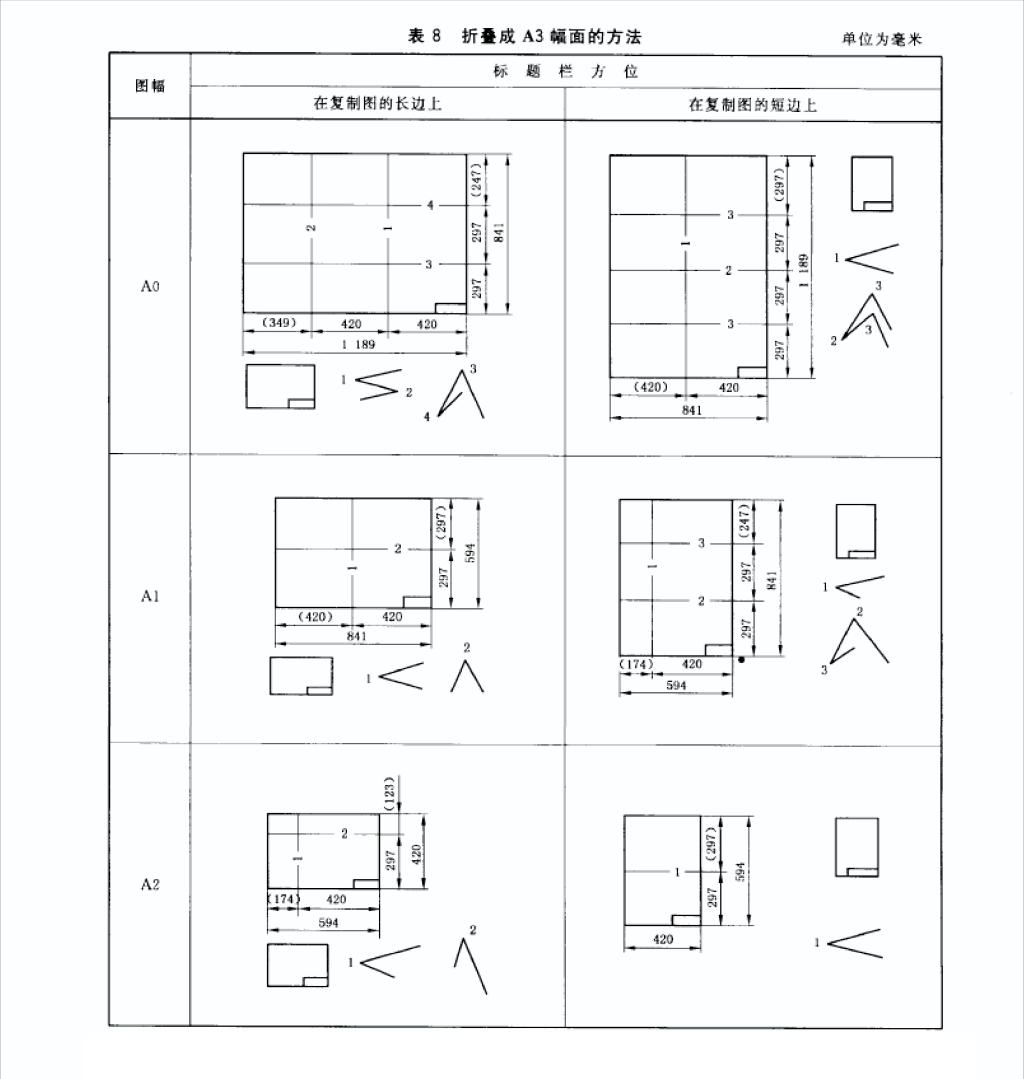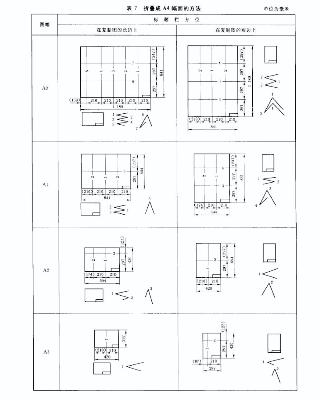 首先沿标题栏的短边方向折叠,然后再沿标题栏的长边方向折叠成A4或A3的规格,使标题栏露在外面,如表7和表8所示。