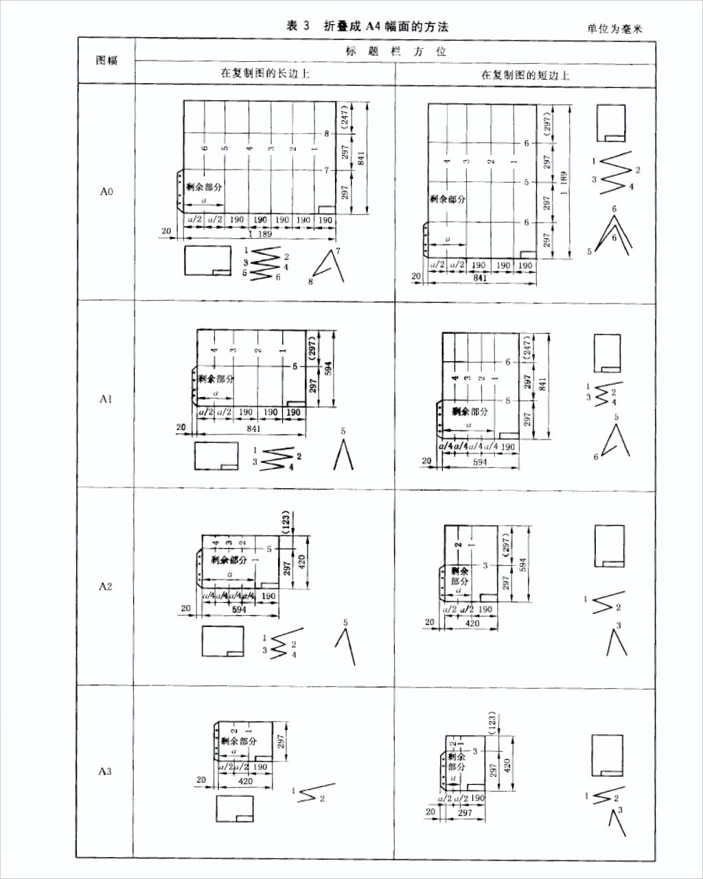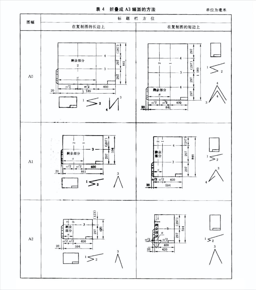 首先沿标题栏的长边方向折叠,然后再沿标题栏的短边方向折叠成A4或A3的规格,使标题栏露在外面,如表5和表6所示。