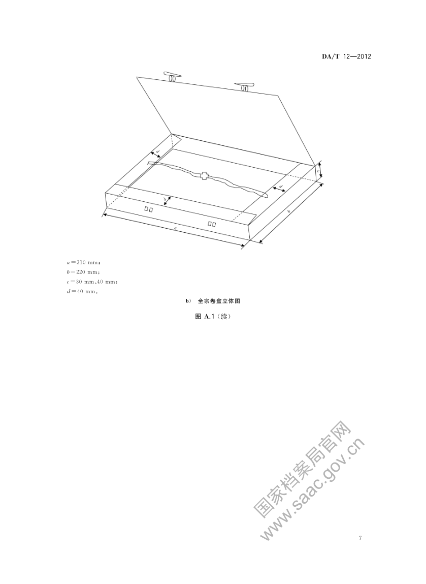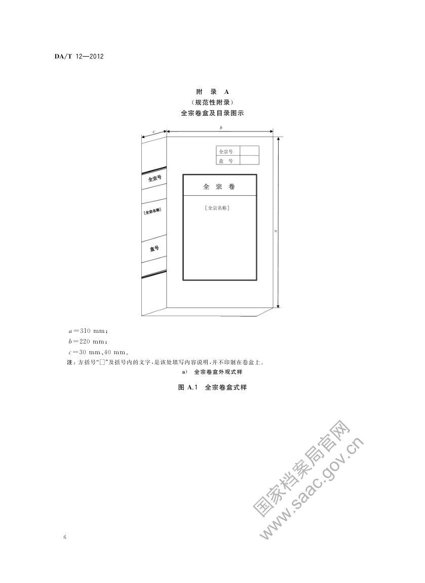 8.1 全宗卷装具采用无酸纸制作的翻盖式卷盒。封面与脊背分别设置“全宗号”“全宗名称”“盒号”等填写项目,卷盒的外形尺寸为310 mm×220 mm(长×宽),盒脊厚度为30 mm、40 mm 两种规格。卷盒式样见图 A.1。