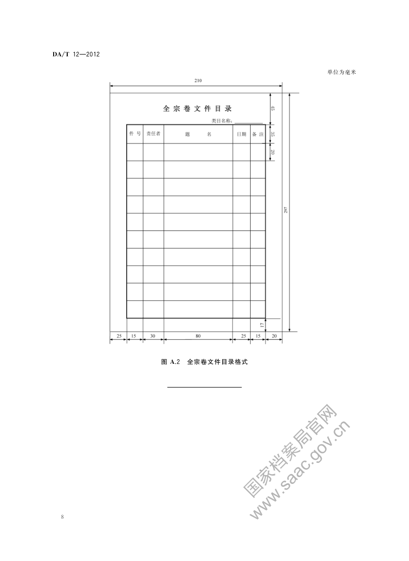 8.2 全宗卷文件目录采用 A4(长×宽为297 mm×210mm)纸张、表格形式,设置“类目名称”“件号”“责任者”“题名”“日期”“备注”等项目。目录式样见图 A.2。