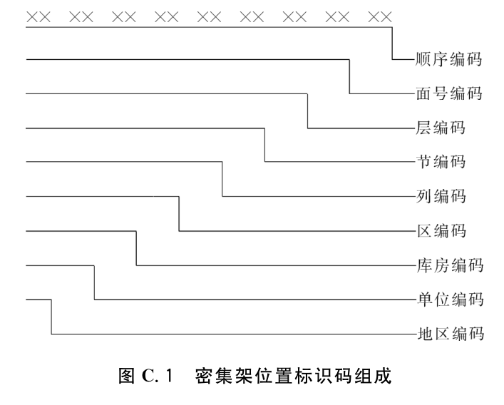 密集架位置标识码是18位数字编码,由地区编码、单位编码、库房编码、区编码、列编码、节编码、层编码、面号编码、顺序编码组成 。具体编码组成结构如图C.1所示: