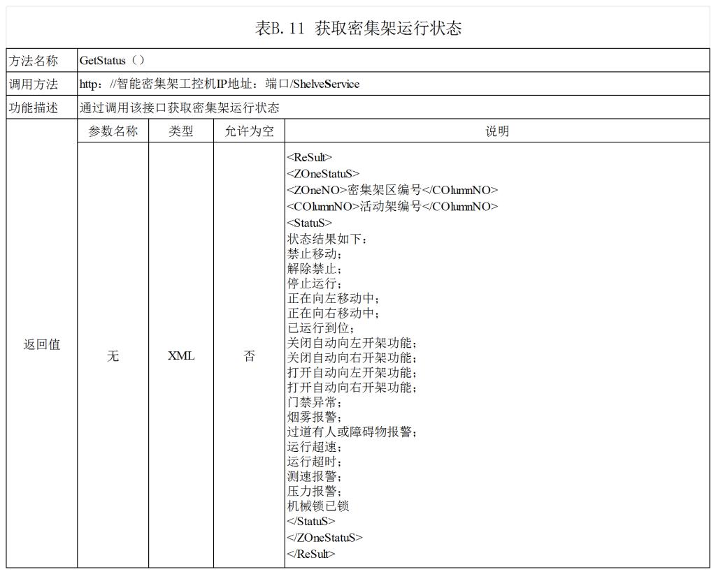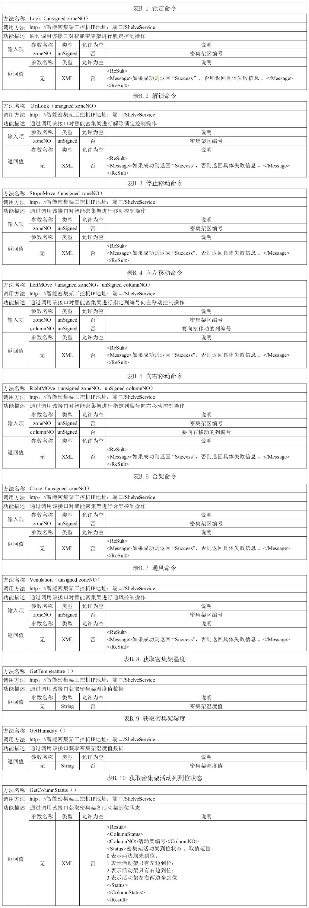 本附录规定了智能密集架工控机与外部系统间的通信要求,并规定接口名称、参数格式(见表B.1~ 表B.11