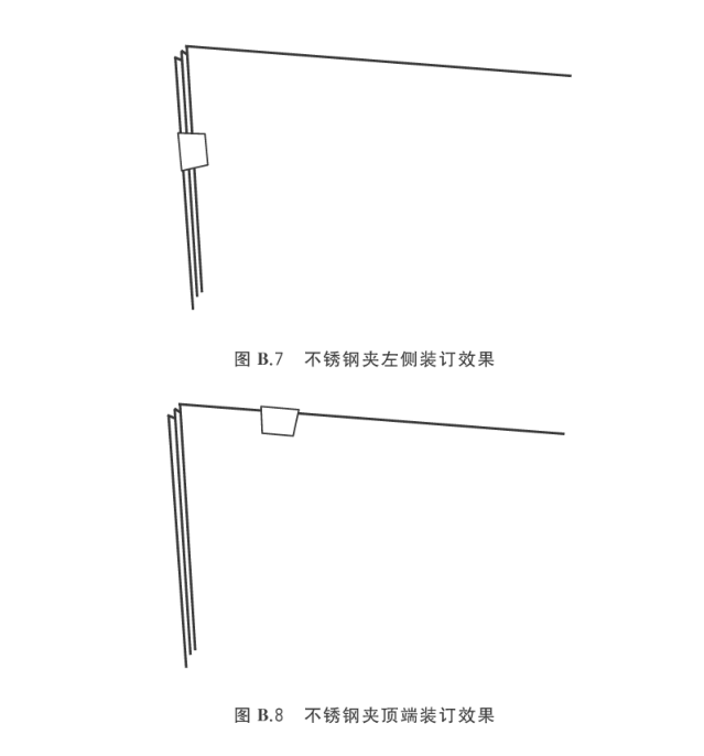 7.6.1 T5不锈钢夹应在归档文件上方或左侧一订装订,订位为不锈钢夹外缘距版面左上角顶端2cm~3cm为宜(见图 B.7、图 B.8)。