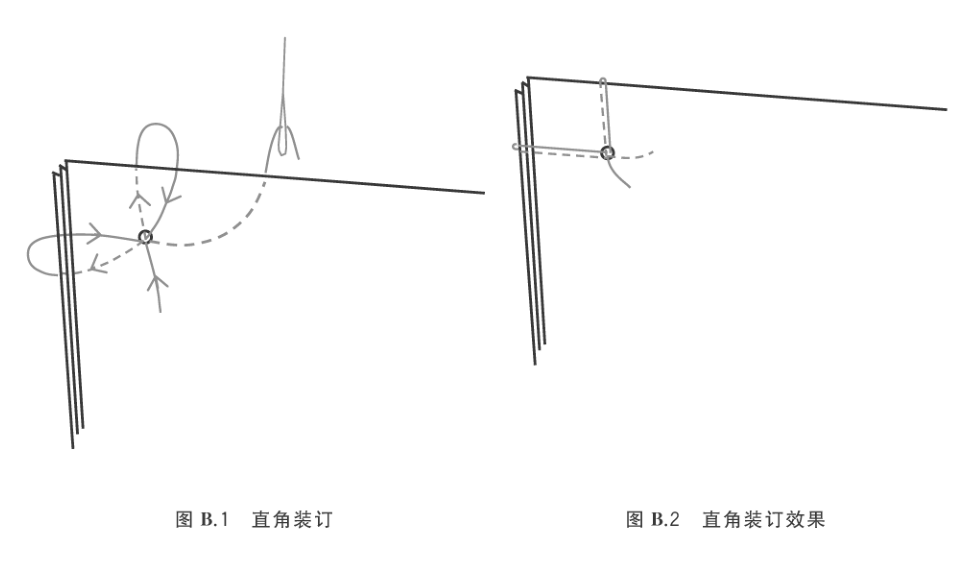 7.2.2 T1直角装订应选取较细缝线针,以双线为宜。拉紧打结后的缝线形成直角,与上方、侧方边缘形成正方形(见图 B.2)。