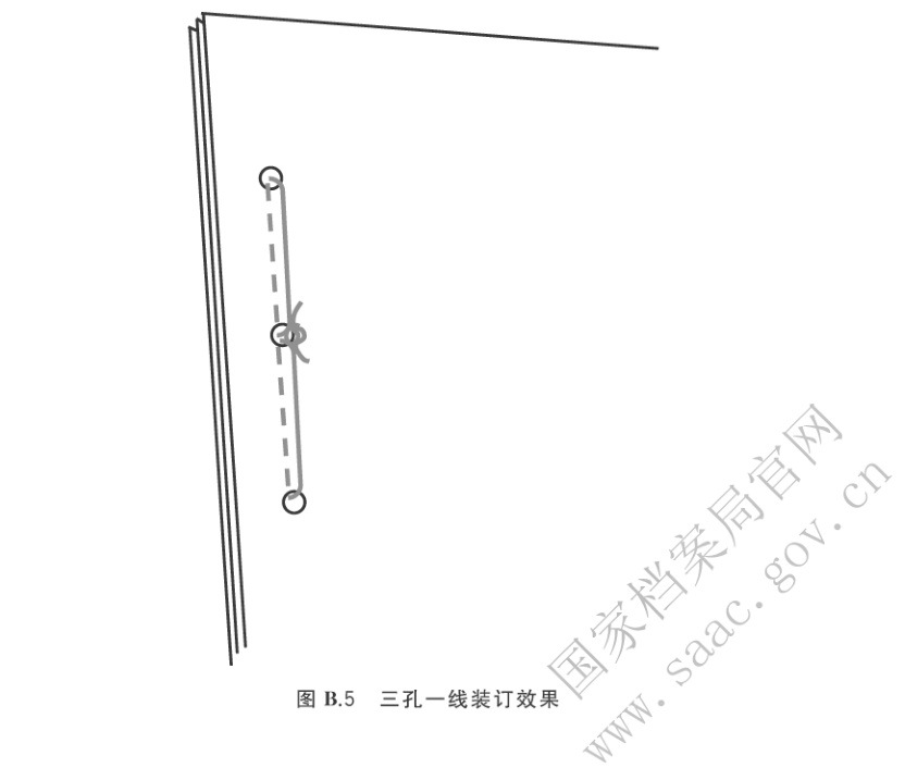 7.4.3 穿线时,先将装订绳对折,将两个绳头并齐后从文件背面穿入中间孔,再将绳头分别向下穿入两边的孔中,并从由装订绳形成的圈中交叉穿过。用力拉紧两个绳头,使装订绳紧缚文件,再将两个绳头在中件孔处打结(见图 B.4)。