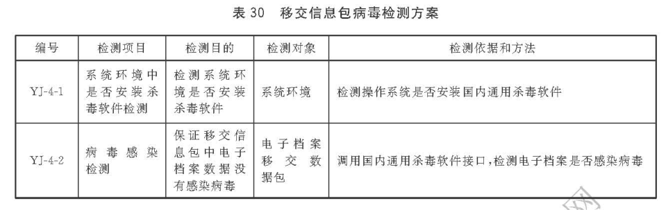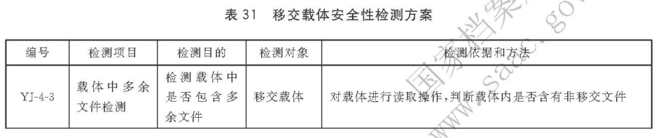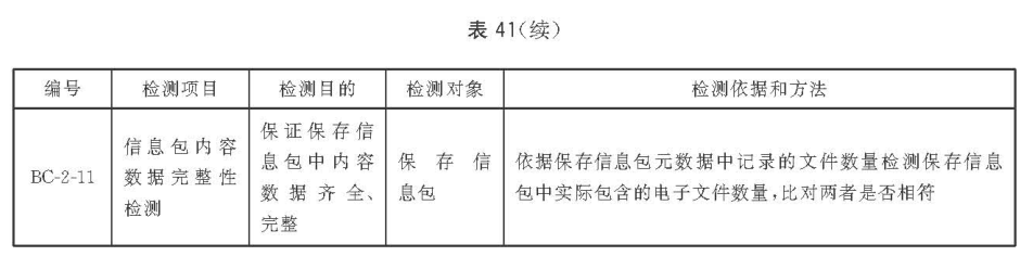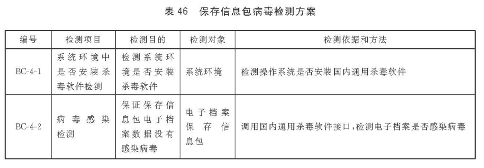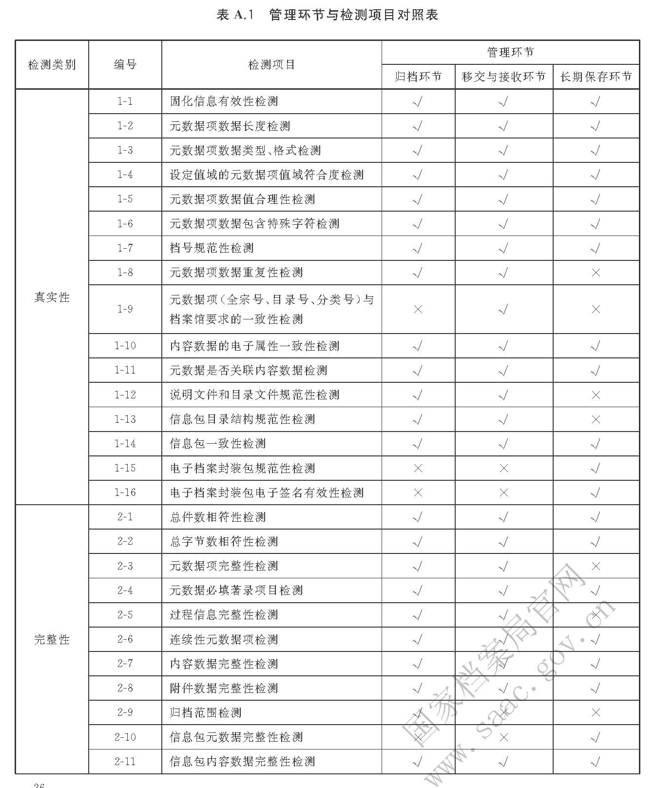 检测项目总计45项,包括真实性、完整性、可用性、安全性四个类别,其中真实性检测项目16项,完整性检测项目11项,可用性检测项目9项,安全性检测项目9项,覆盖电子文件归档环节电子档案移交与接收环节和电子档案长期保存环节。管理环节与检测项目的对照表参见附录A。