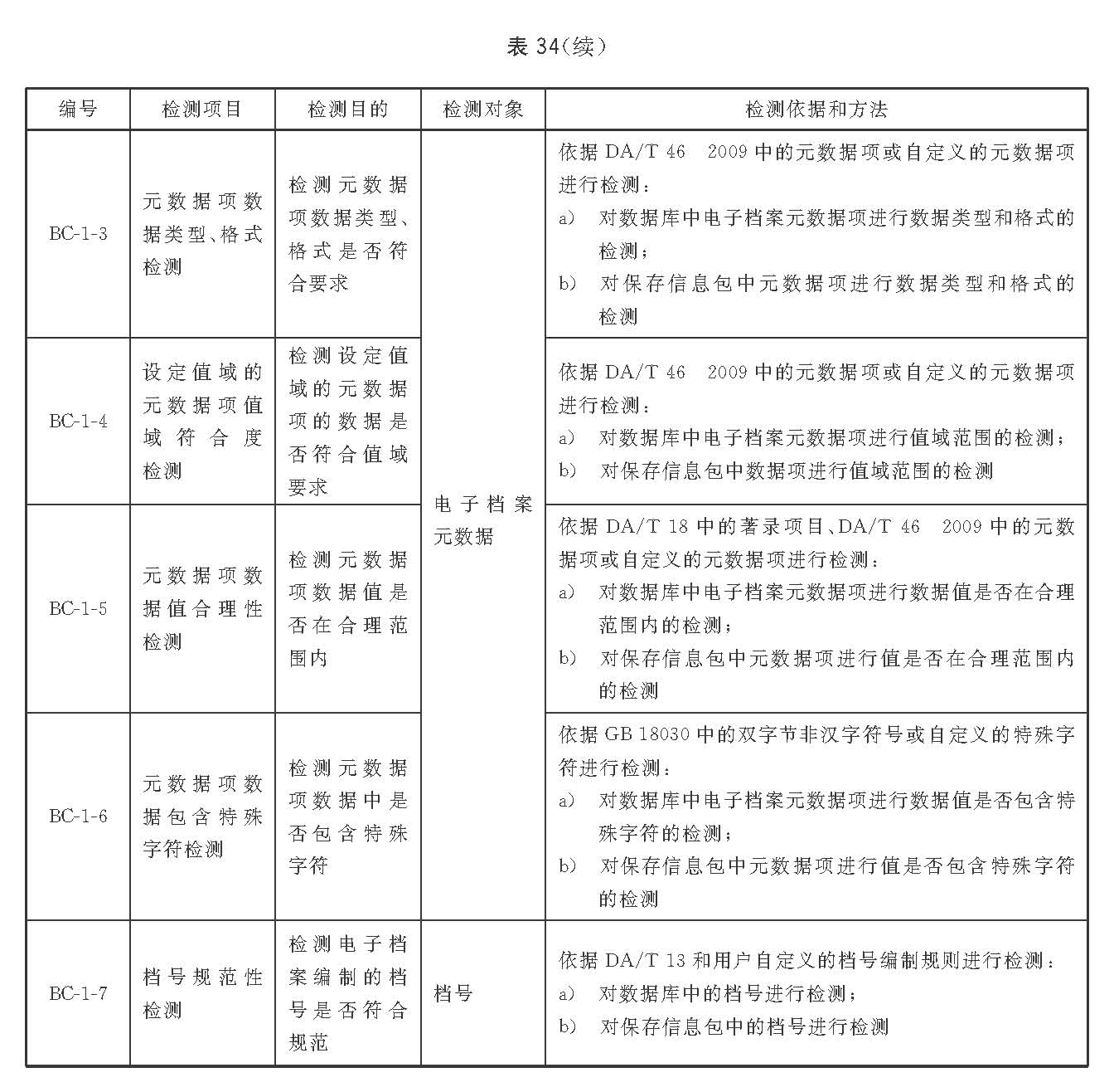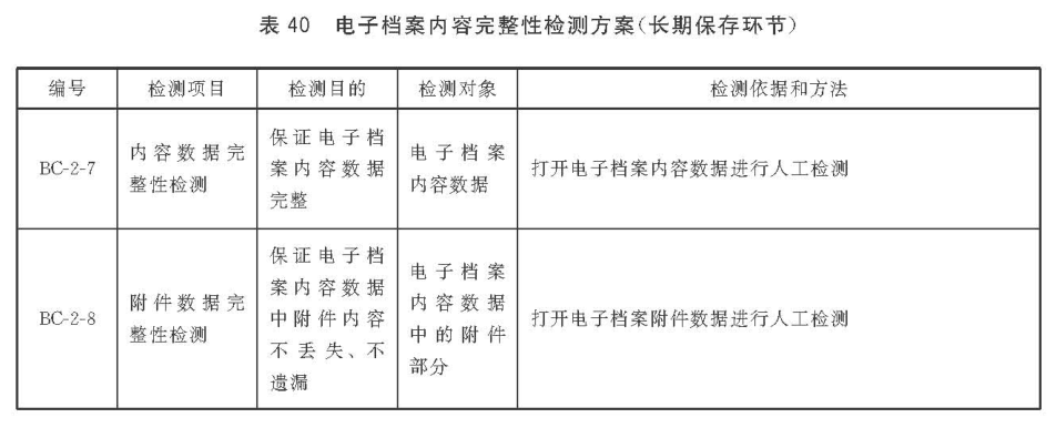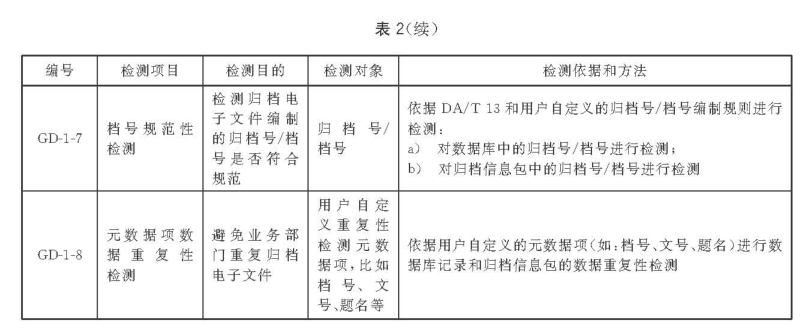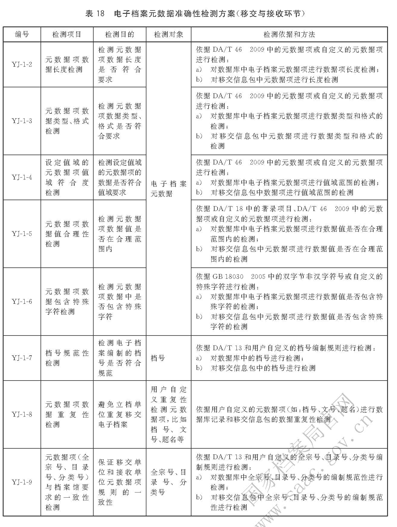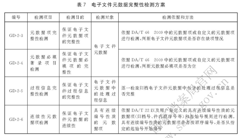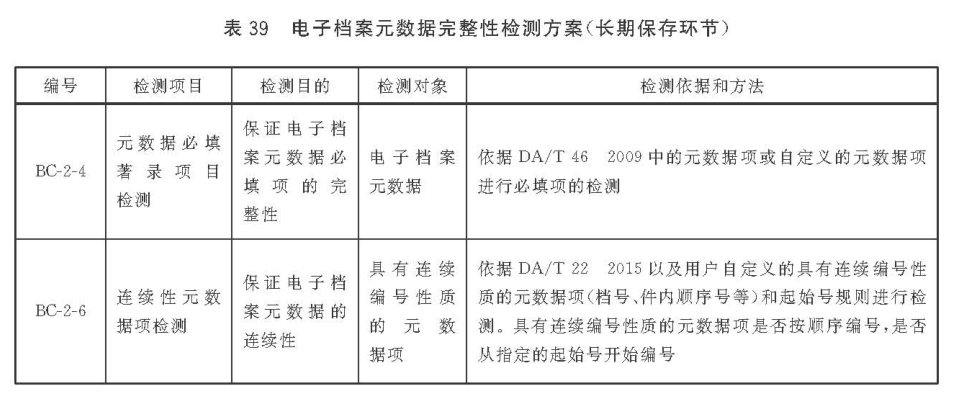 对照 DA/T 46一2009 或自定义元数据方案,检测元数据项是否齐全完整;反映重要问题的归档电子文件是否包括主要修改过程和办理情况记录;具有连续编号的元数据项(比如归档号、件内顺序号等是否有漏号现象等。