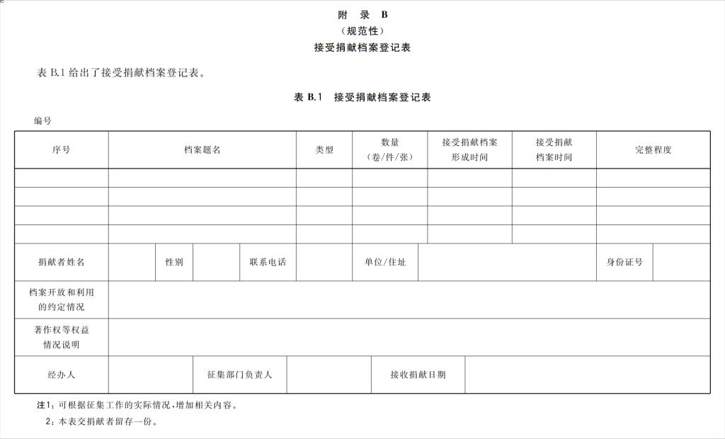 征集部门对接受捐献事项形成决策意见建议,提交主要负责人或馆务会批准。与接受捐献者签订档案接受捐献协议,核对档案数量,明确征集档案的所有权和处置权,明确捐献者的其他特殊约定;填写《接受捐献档案登记表》(见附录 B), 清点登记入库。