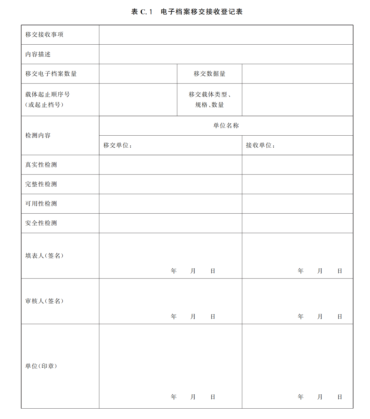 表 C.1 规定了电子档案移交接收登记表的样式。