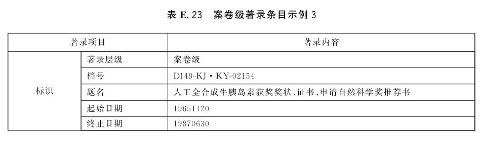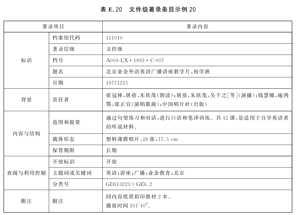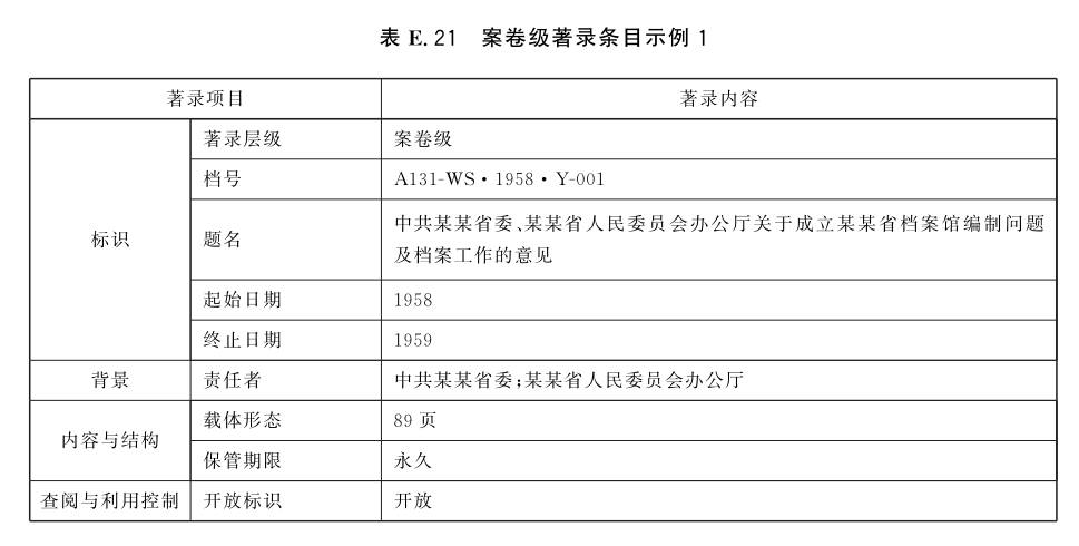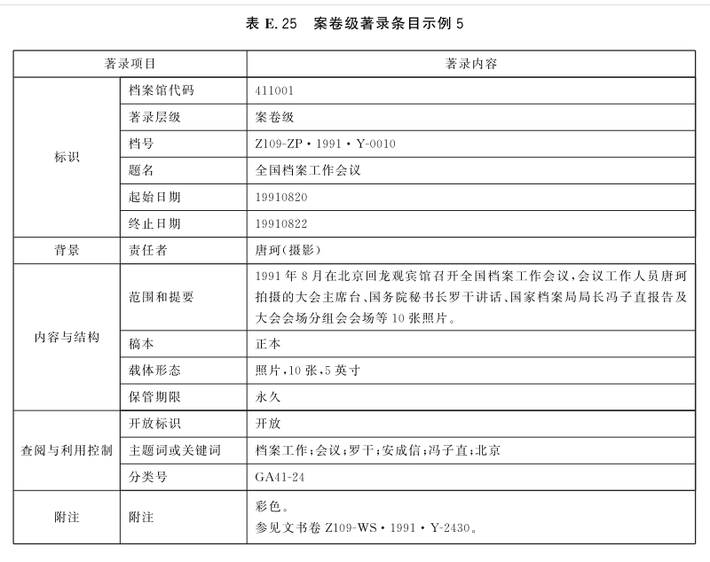 表E.21~表E.25给出了案卷级的著录条目示例。