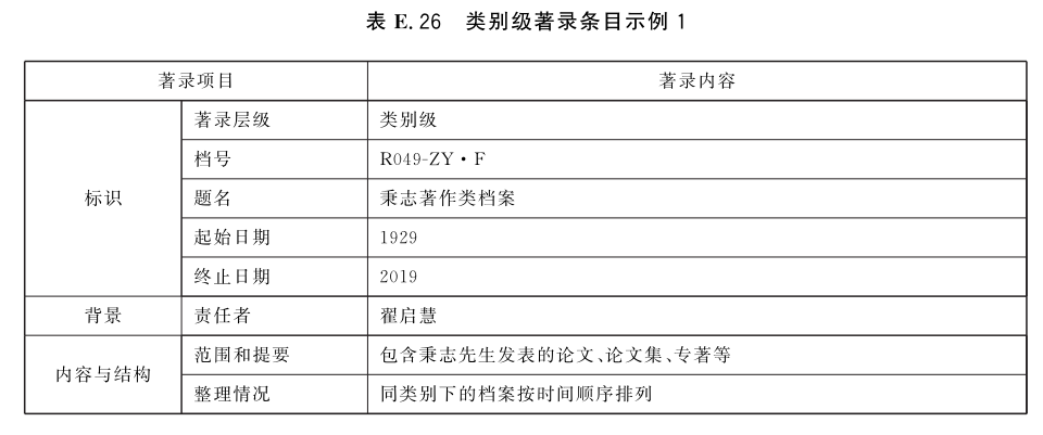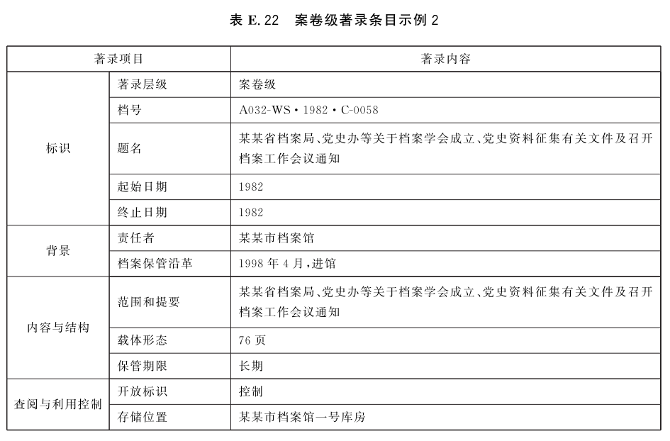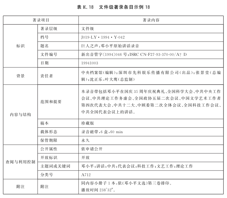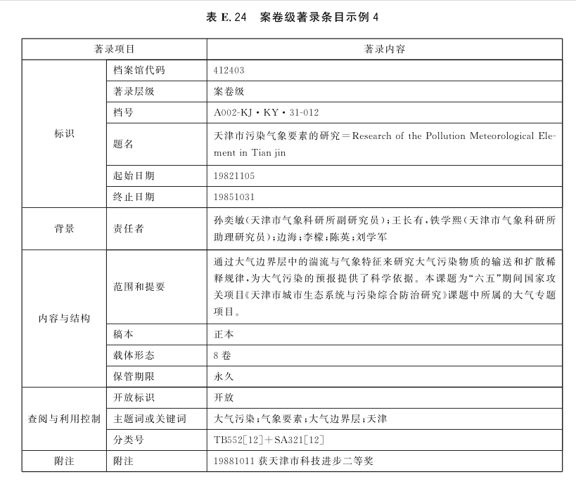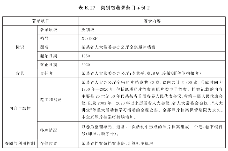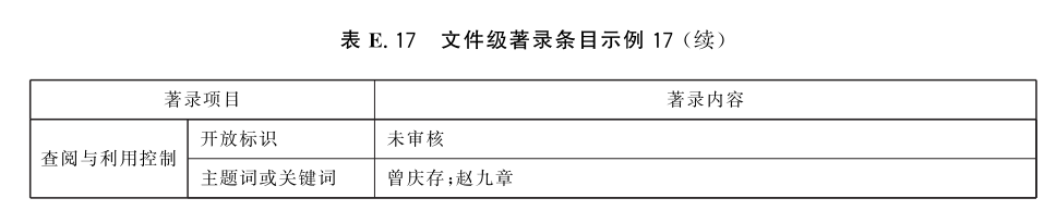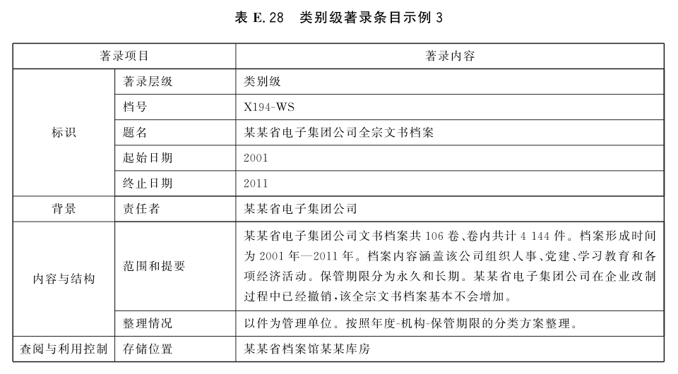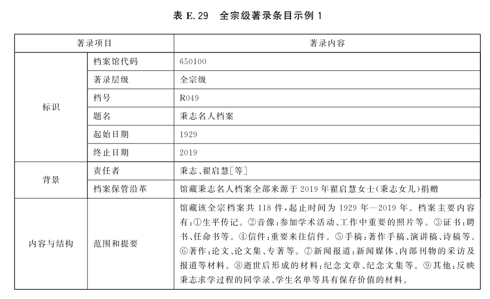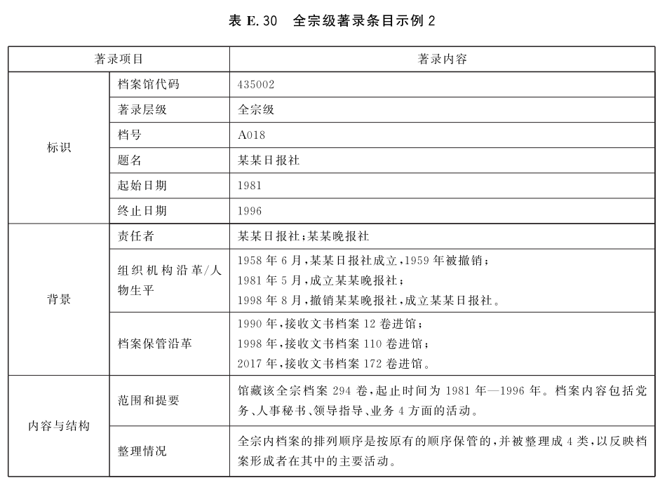表E.29和表E.30给出了全宗级的著录条目示例。