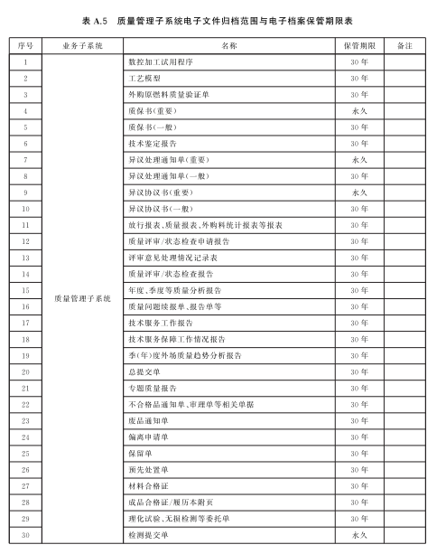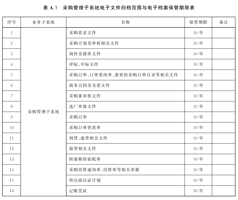 本附录列出ERP系统电子文件归档范围和电子档案保管期限表,表A.1是采购管理子系统电子文件归档范围与电子档案保管期限表,表A.2是物料管理子系统电子文件归档范围与电子档案保管期限表,表A.3是生产计划管理子系统电子文件归档范围与电子档案保管期限表,表A.4是设备管理子系统电子文件归档范围与电子档案保管期限表,表A.5是质量管理子系统电子文件归档范围与电子档案保管期限表,表A.6是销售管理子系统电子文件归档范围与电子档案保管期限表,A.7是项目管理子系统电子文件归档范围与电子档案保管期限表,A.8是主数据电子文件归档范围与电子档案保管期限表,供企业制定ERP系统电子文件归档范围与电子档案保管期限表时参考。