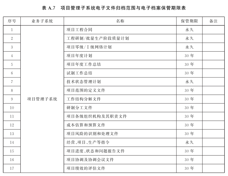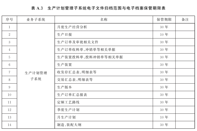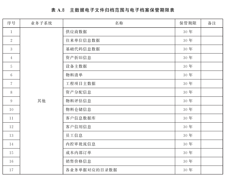 7.2.1 ERP系统电子文件归档时应划定保管期限,保管期限分为永久和定期,定期一般为30年和10年,具体见附录A。